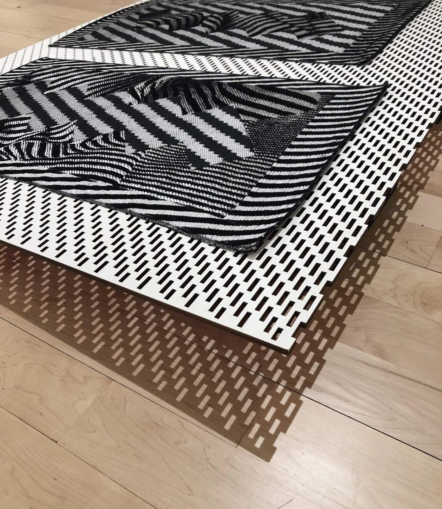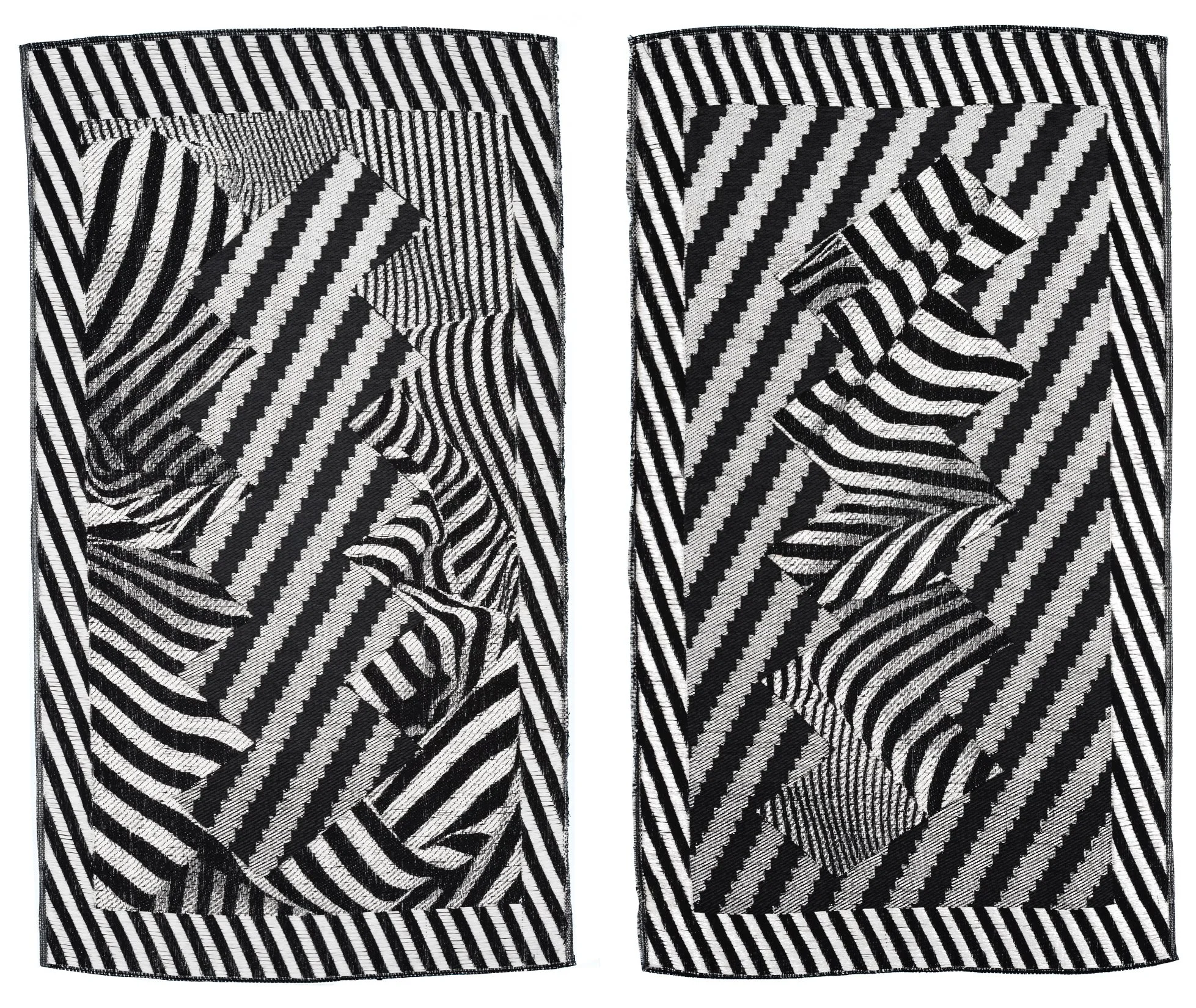 Zags Zig, (left) Zigs Zag, (right) Hand woven on a Digital TC2 loom, tencel, nylon, polyester, paper, laser cut board, paint, bricks 21" x 42 "